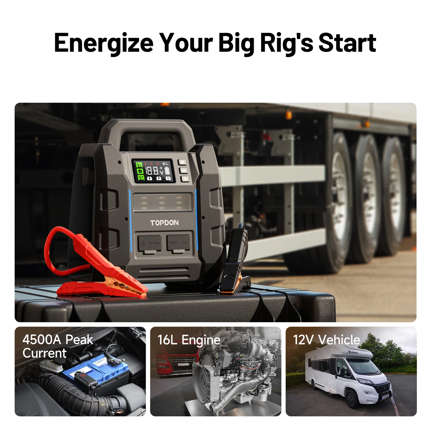 TOPDON V4500 Plus je navrhnutý pre 12 V vozidlá – od osobných áut, cez dodávky, SUV a karavany, až po nákladné vozidlá, traktory a pracovné stroje. Vysoký štartovací prúd pomáha prebrať k životu aj batérie, ktoré by ste už inak považovali za „mŕtve“.